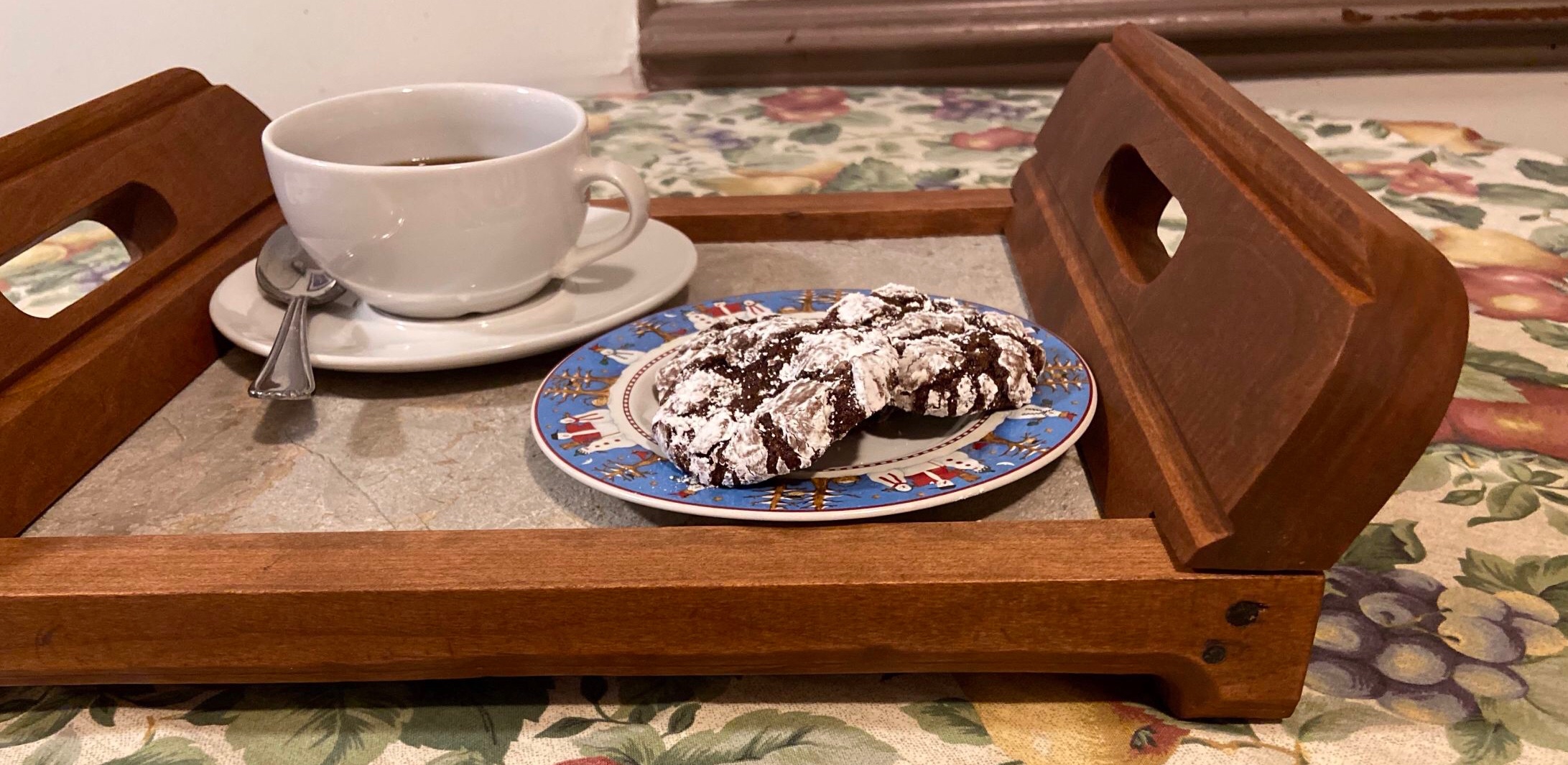 This new design is a shorter version and combines elements from similar trays with 16-1/2 x 11-1/2 x 4-1/2 dimensions. It’s perfect for smaller spaces or serving drinks. The 1/2” etched marble’s colors blend naturally with the cherry making a nice transition in a matte finish. This is a substantial, solid sturdy tray with a classic design.