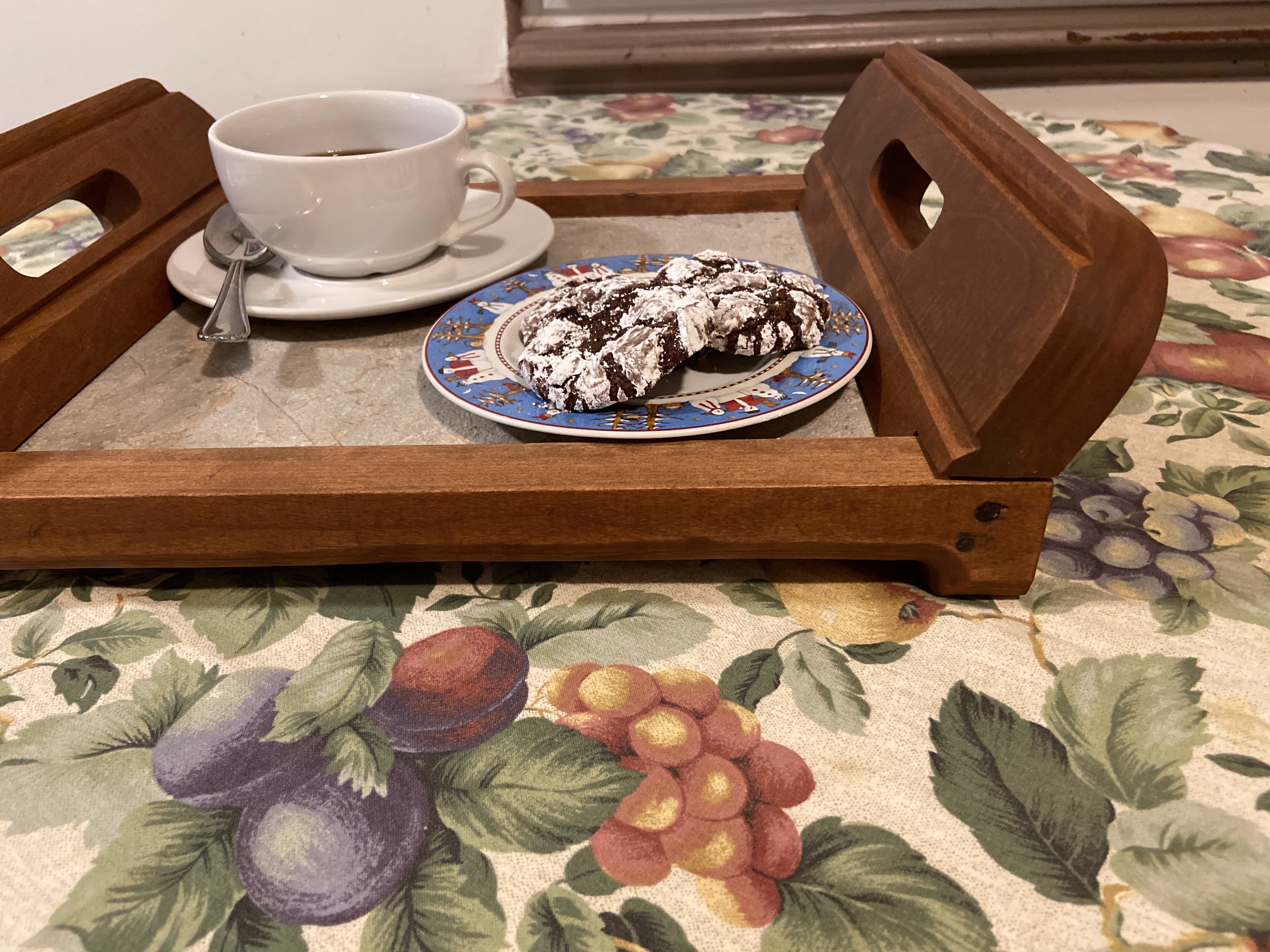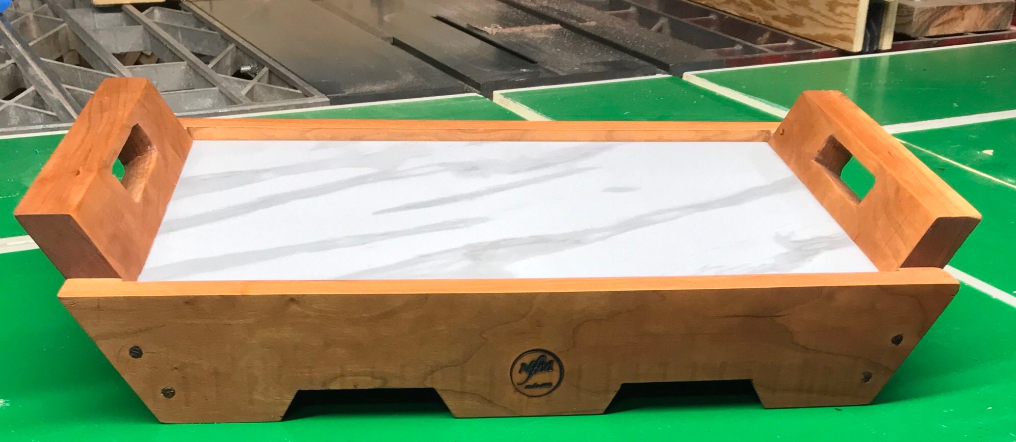 This new design is a shorter version and combines elements from similar trays with 16-1/2 x 11-1/2 x 4-1/2 dimensions. It’s perfect for smaller spaces or serving drinks. The 1/2” etched marble’s colors blend naturally with the cherry making a nice transition in a matte finish. This is a substantial, solid sturdy tray with a classic design.