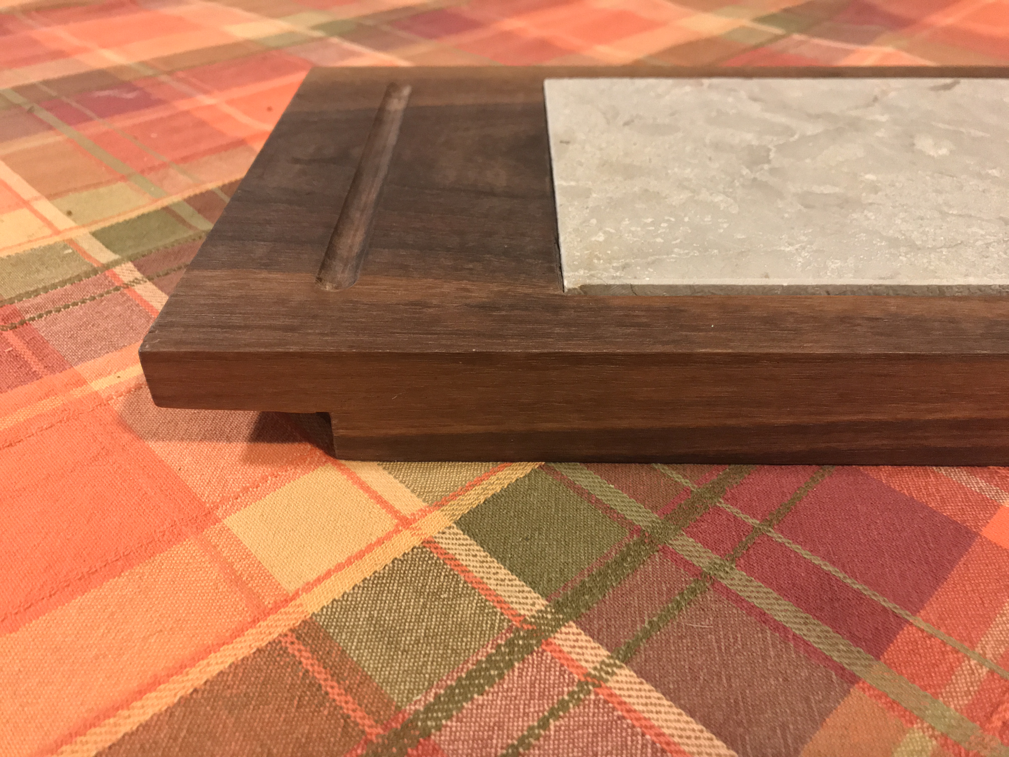 Bandung Gris Marble keeps dinner warm on this beautiful piece of finished Walnut and Marble topped Hearth (6-1/2” x 12” x1/2”). The Walnut (8-1/4”x 19-1/2” x 1-1/4”) has 3 coats of a hand rubbed mixture of waxes with orange oil.
